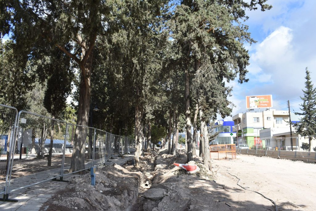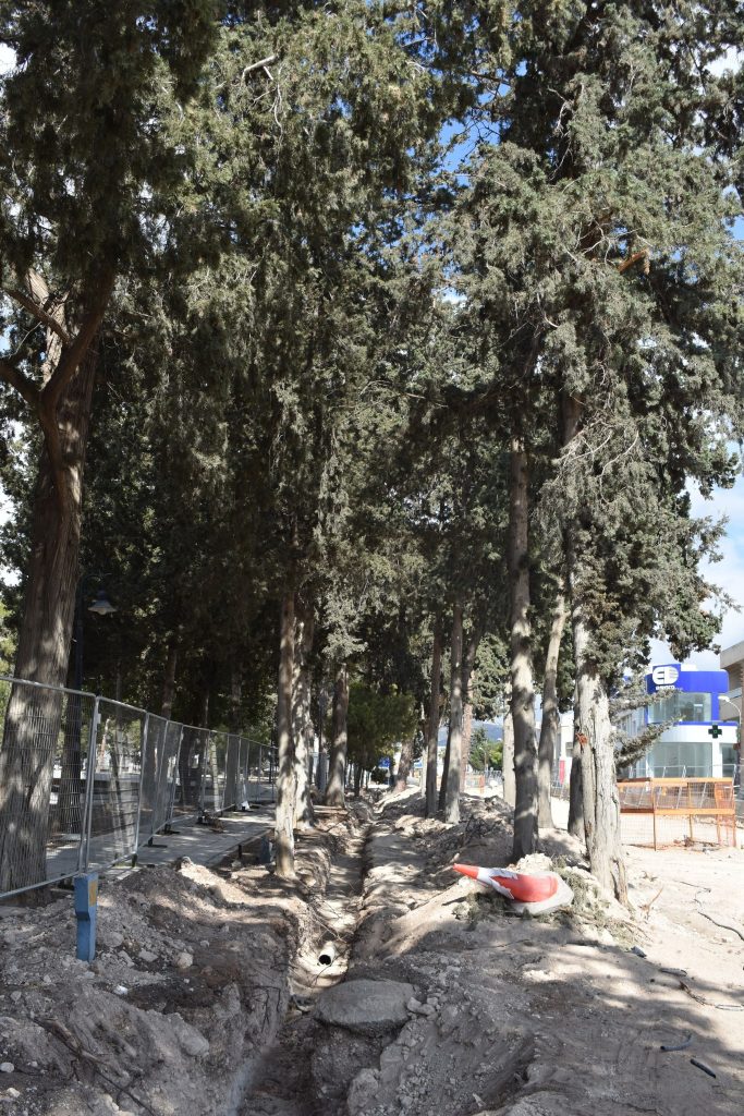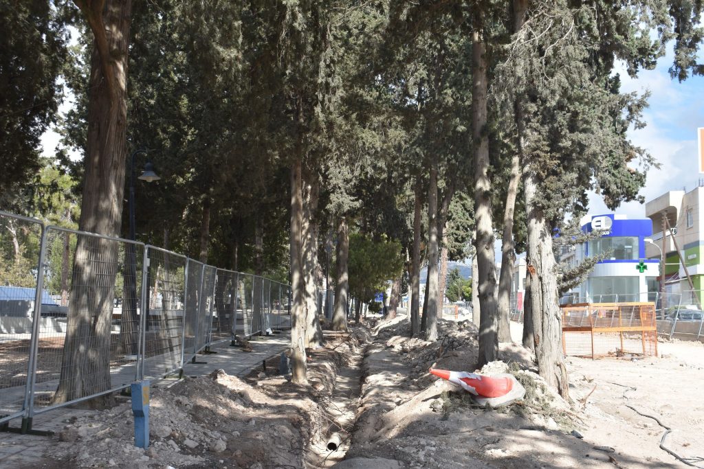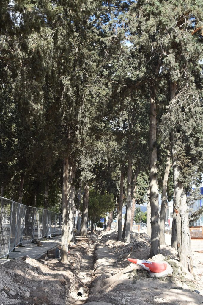 Εδώ και δύο μήνες περίπου ξεκίνησαν τα έργα. Ήδη μεταξύ δύο σειρών δέντρων έγιναν εκσκαφές και τοποθετήθηκαν αγωγοί με αποτέλεσμα να επηρεαστεί το ριζικό τους σύστημα.