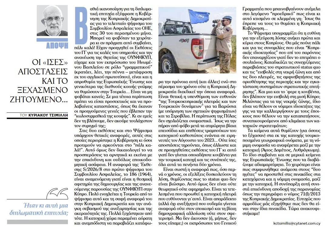 Στις δυο εκθέσεις και στο Ψήφισμα υπάρχουν θετικές αναφορές, αυτές στις οποίες περιορίστηκε η Κυβέρνηση κι όσοι προτιμούν να αρκούνται στο “πάλι καλά!”. Αυτό όμως δεν δικαιολογεί το να προσπεράσεις τα αρνητικά κι εκείνα με την επικίνδυνη και ουδόλως εποικοδομητική ασάφεια. Η αναφορά της Έκθεσης S/2026/8 στο πρώτο ψήφισμα του Συμβουλίου Ασφαλείας, το 186 (1964), είναι αναμενόμενη γιατί είναι η θεσμική αφετηρία της δημιουργίας και της ανανεούμενης παρουσίας της ΟΥΝΦΙΚΥΠ στην Κύπρο. Πολύ ενοχλείται η Τουρκία από το ψήφισμα αυτό και τη σαφή αναφορά του στην Κυπριακή Δημοκρατία και την ανάγκη σεβασμού της ανεξαρτησίας και της ακεραιότητάς της. Πολλά ξεχάστηκαν από τότε. Η κατοχική χώρα παραμένει αόρατη και ανεμπόδιστη να παραβιάζει κατάφωρα την πρόνοια αυτή (και άλλες) ενώ στο πέρασμα του χρόνου ούτε η Κυπριακή Δημοκρατία διεκδικεί την όποια αναφορά. Είναι θετική η υπενθύμιση των ευθυνών “της Τουρκοκυπριακής πλευράς και των Τουρκικών δυνάμεων” για τα Βαρώσια (με υπόμνηση των σχετικών ψηφισμάτων) και τα Στροβίλια. Η περίπτωση της Πύλας δεν σχολιάζεται ονομαστικά. Ίσως να την πήραν από φόβο μετά τα ατιμώρητα βίαια επεισόδια και επιθέσεις τραμπούκων του κατοχικού καθεστώτος ενάντια σε ειρηνευτές τον Αύγουστο του 2023… Ούτε ίσες αποστάσεις τηρούνται, όπως άλλωστε και σε προηγηθείσες εκθέσεις του Γενικού Γραμματέα κι αυτό γιατί δεν γίνεται οποιαδήποτε κουβέντα για την τουρκική κατοχή και τις συνέπειές της, όλα αυτά τα πενήντα δύο χρόνια.